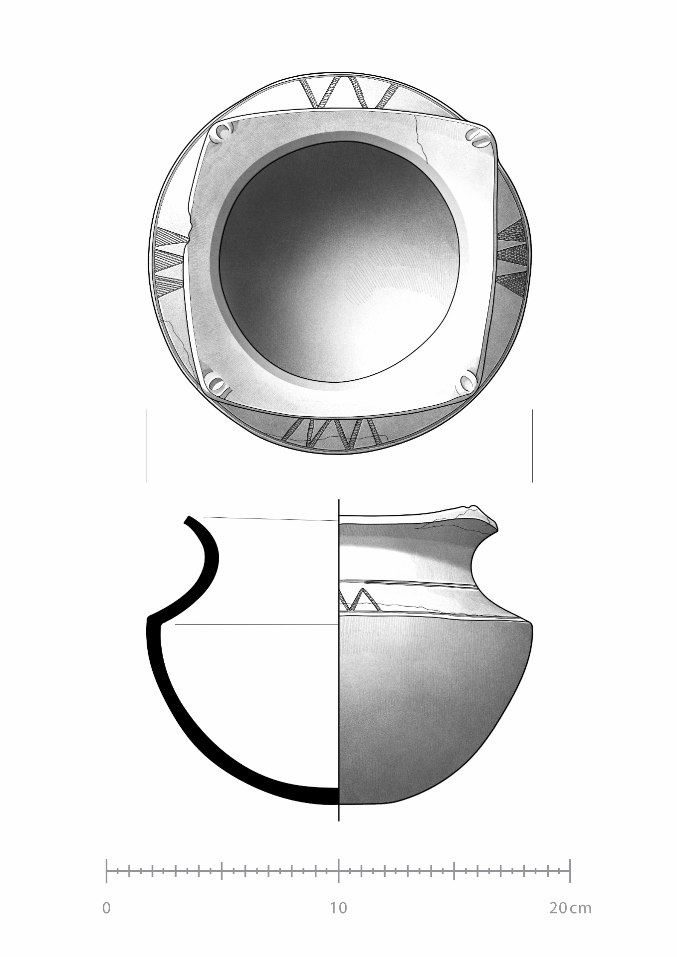 Observaciones decoración: La cerámica posee decoración triangular esgrafiada que varia de diseño en las 4 caras. El borde de la olla posee decoración en las esquinas que fue modelada con dedos.